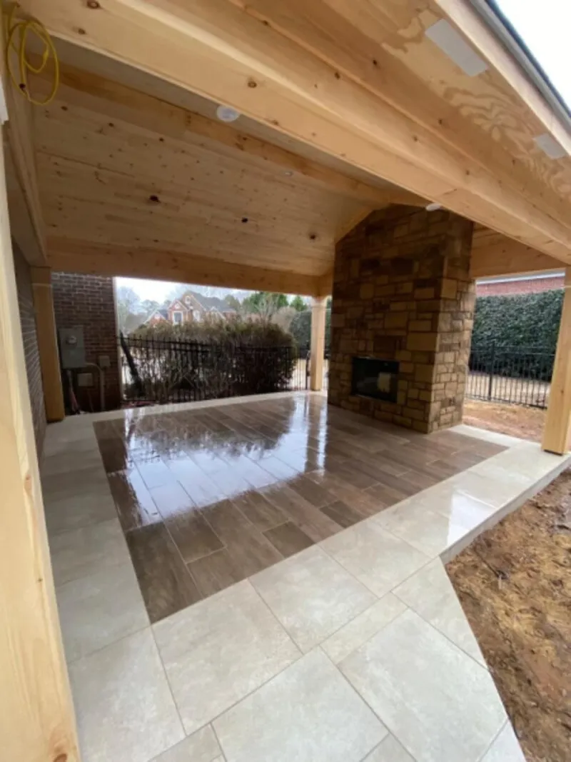 The porcelain pavers provide a modern, clean aesthetic with virtually zero maintenance — no sealing required, and they won’t fade or stain like traditional concrete pavers. The fireplace uses natural stone veneer for a rustic contrast against the sleek patio surface.
